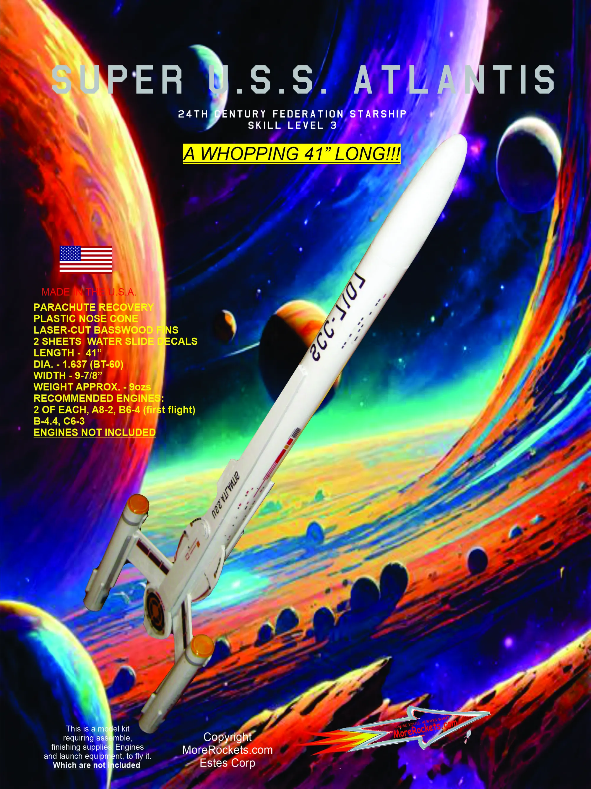 Ages 12 and up. Adult supervision for those under 14. Engines and launch-systems required to fly this rocket are not included. Kit requires assembly. Construction supplies required to build this rocket are not included.Contains one model kit.